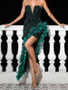 This strapless long dress features a high-waist design with an irregular skirt hem. adding a touch of modern flair to a classic silhouette. The solid color base is elegantly enhanced with feather accents and shimmering sequins. creating a captivating look. The deep V sheer mesh and backless design. complemented by a lace-up detail and zipper closure. offer both allure and functionality. Available in champagne. dark green. and black. and in sizes ranging from S to XXXL. this dress is tailored for those who appreciate refined elegance.