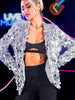This silver women's sequin tuxedo jacket features a long sleeve design. which is both warm and comfortable. making it an ideal choice for autumn and winter.